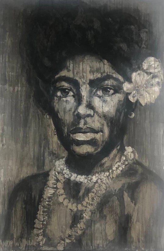 Het schilderij "vrouw uit Samoa" heb ik geschilderd met acrylverf, afwisselend met houtskool. De gelaagdheid in dit portret is ontstaan doordat ik vanuit een ondergrond heb gewerkt, iedere laag in het schilderij heeft een betekenis. Als spannend contrast met de ruwheid van houtskool heb ik parelmoerverf gebruikt wat een prachtige glans en weerspiegeling geeft.