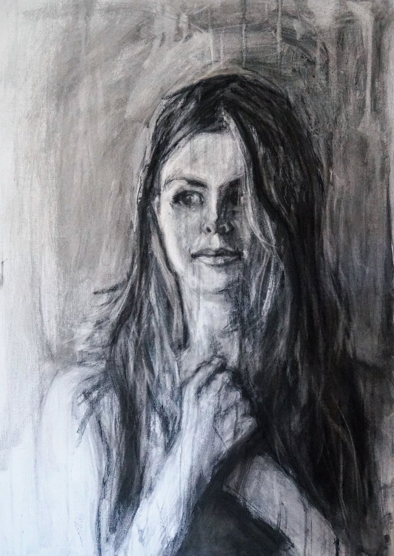 Portret in houtskool op linnen doek afm. 70 x 100